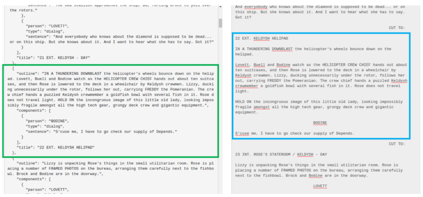 图 A9:这里展示了一个解析后的剧本示例。左侧块显示了格式化后的剧本片段,右侧块显示了对应的原始剧本片段,来自《泰坦尼克号》。