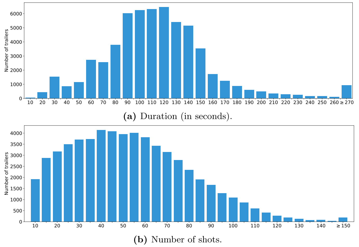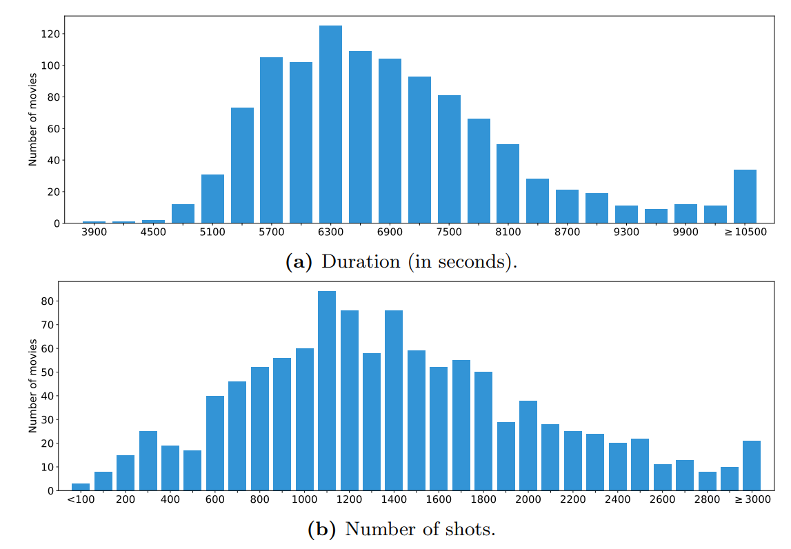 如论文中所述,MovieNet包含1100部电影。图A6展示了这1100部电影的部分统计信息,包括时长和镜头数量的分布。如A.1节所述,除了这1100部电影外,我们还尽可能提供了其他电影的元信息,下文介绍的预告片、图片等其他数据类型也是如此,不再单独说明。