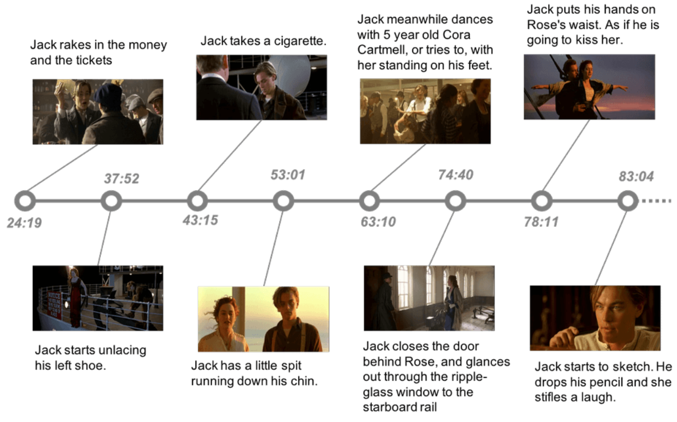 图 A10:剧本对齐的定性结果。该示例来自电影《泰坦尼克号》。每个带有时间戳的节点都与一个匹配的故事情节片段和一张快照图片相关联。