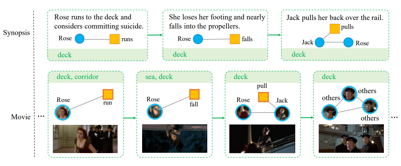 由于事件比角色和场景更为复杂,用自然语言描述是表示事件的合适方式。先前的工作已实现将剧本[46]、描述性视频服务(DVS)[57]、书籍[91]或维基剧情[66,67,68]与电影对齐。然而,书籍与电影往往差异较大,难以良好对齐;DVS文本难以获取,限制了基于该类数据的数据集规模[57];维基剧情通常是简短摘要,无法涵盖电影的所有重要事件。鉴于上述问题,我们选择剧情梗概作为MovieNet中的故事描述。电影片段与剧情梗概段落之间的关联由三名不同的标注人员通过"粗到细"的流程人工标注*。最终,我们获得了4208个高度一致的段落-片段对。*