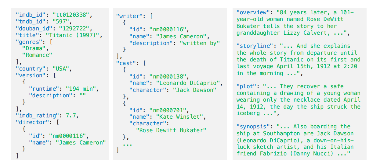 图2:MovieNet是一个用于电影理解的综合数据集,包含来自不同模态的海量数据以及不同方面的高质量标注。此处我们展示了MovieNet中《泰坦尼克号》的部分数据(蓝色)和标注(绿色)。
