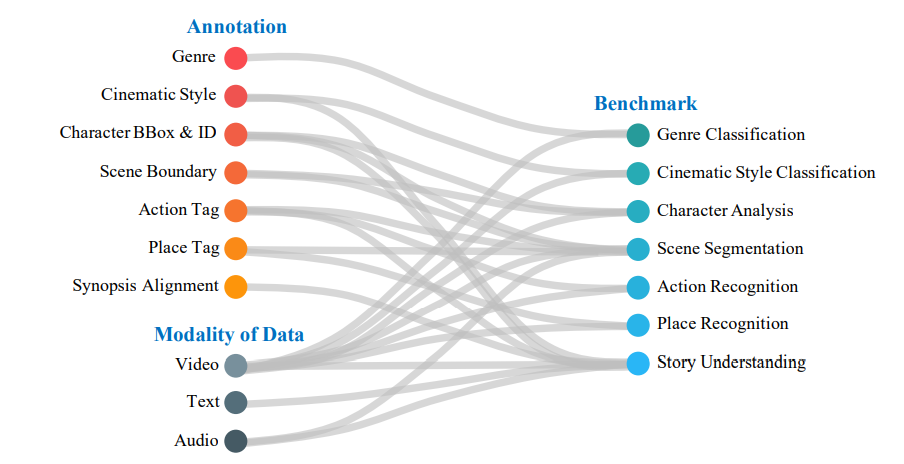 图1:MovieNet中的数据、标注、基准及其关系,共同构建了一个全面的数据集,用于对电影进行全面理解。