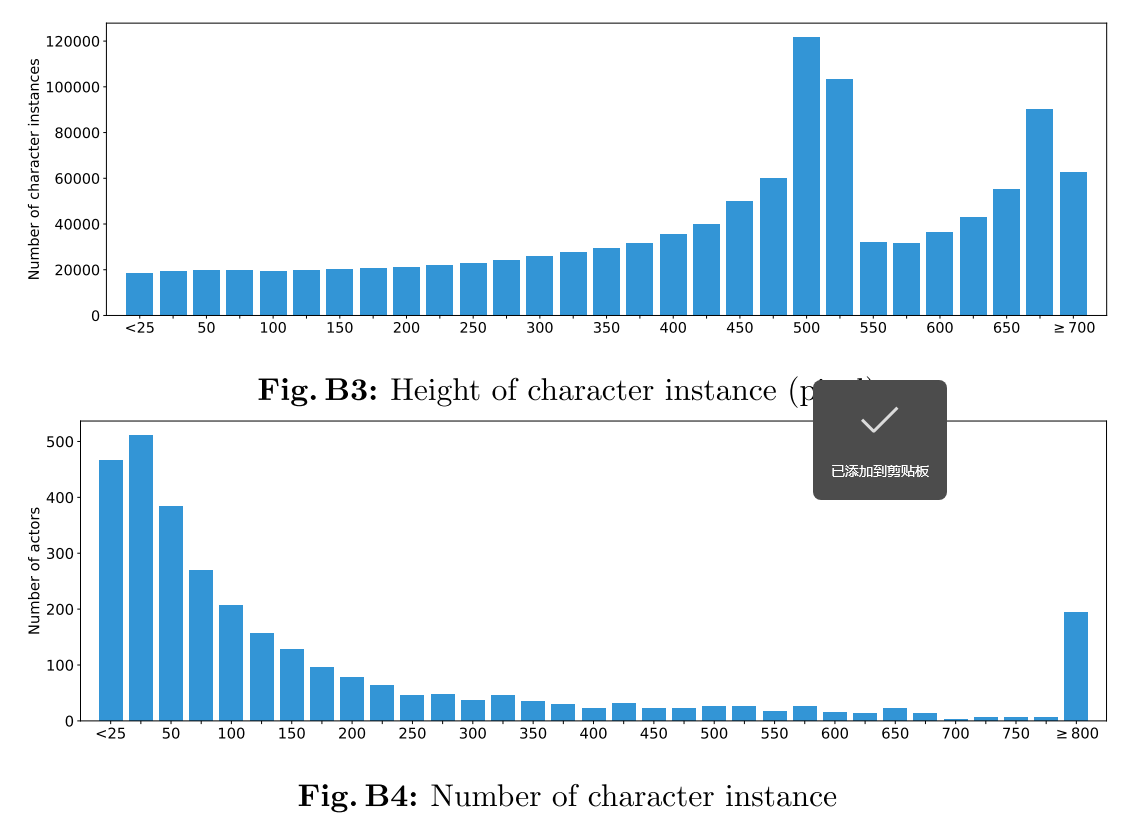 图 B5:角色边界框和身份注释的统计数据,包括角色实例的高度和角色实例的数量。