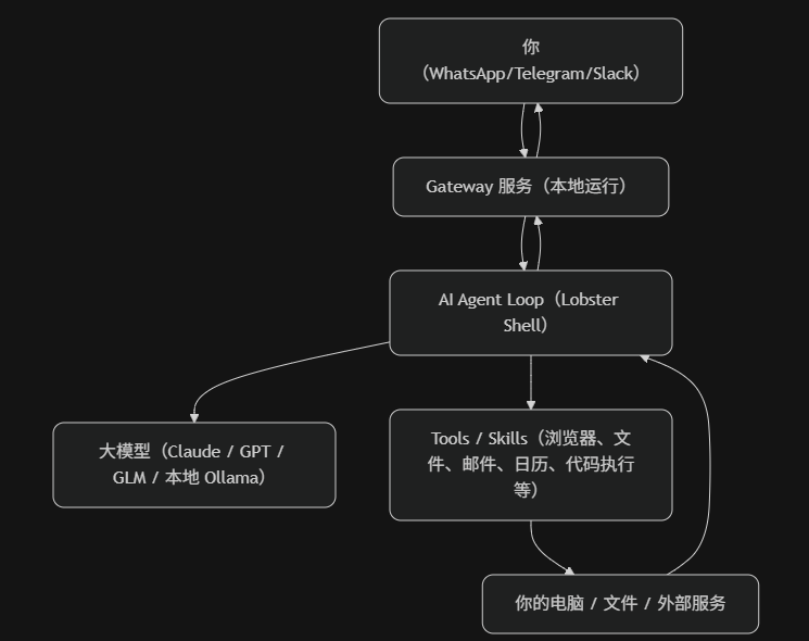 一句话核心定位:Moltbot = 大模型(Claude/GPT等) + Lobster工作流引擎 + 多平台聊天网关 + 可扩展Skills,你的24/7本地AI员工。
