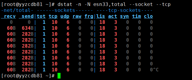 [root@yyzcdb81 ~]# dstat -n -N esn33,total --socket --tcp