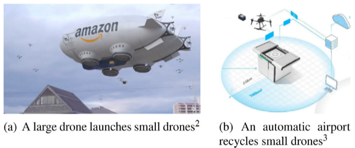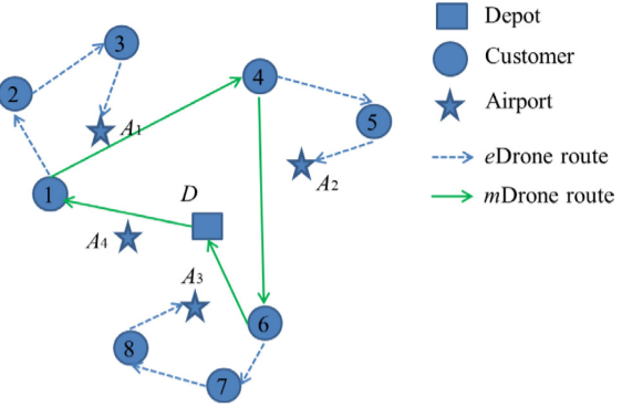 异构无人机末端配送问题(HDDPBO)由一架大型无人机与多架小型无人机协同完成:大型无人机负责运输并在各子区域释放小型无人机,小型无人机在子区域内完成多客户配送后前往自动化机场回收。大型无人机不直接服务客户,所有客户节点仅被小型无人机访问一次。系统假设路径无子回路,自动化机场仅作为临时回收与存储节点,其运营成本不予考虑。