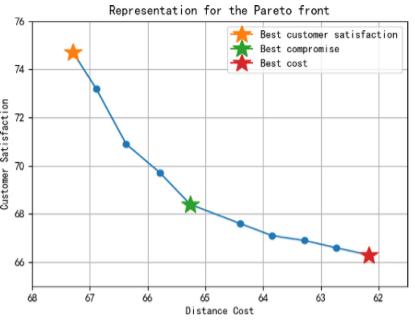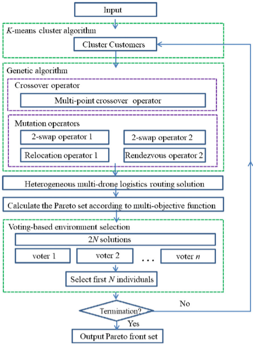 针对异构无人机末端配送路径优化问题,本文提出了一种基于投票机制的集成多目标遗传算法。通过改进聚类方法将客户划分为子区域,降低问题规模,并结合定制化遗传算子与投票式集成策略,提高解的收敛性与多样性。实验结果表明,该方法在合成与实际算例中均优于对比算法,验证了其在无人机末端配送中的有效性与实用价值。