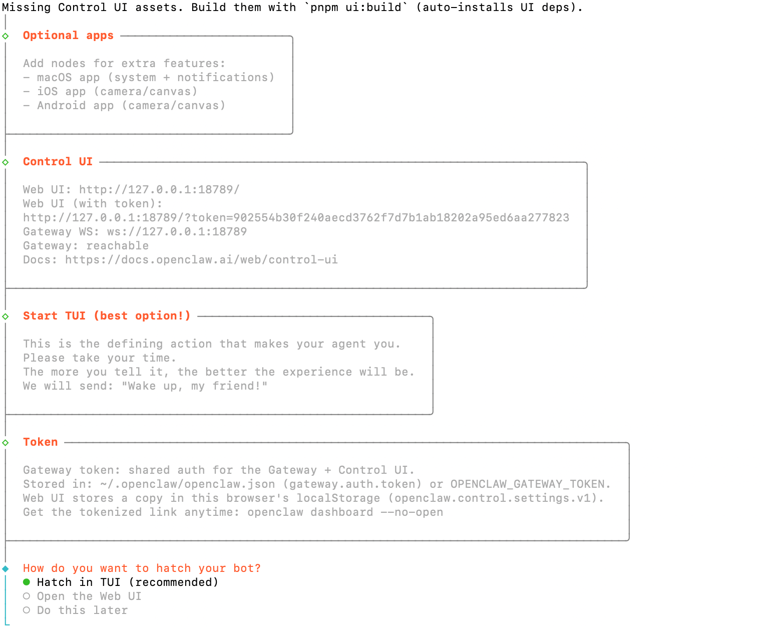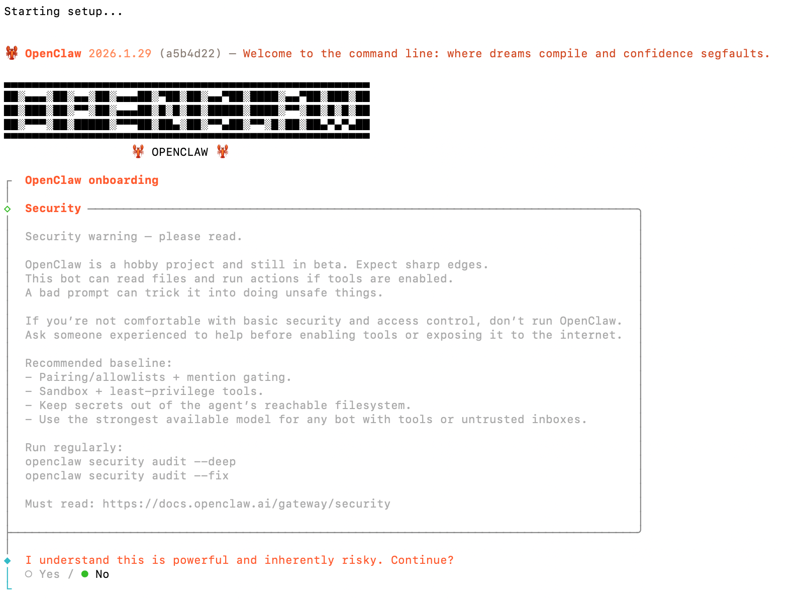 openclaw,终端里会看到这一大段"很吓人"的 ASCII 画和安全提示。别慌,它主要在做 三件事: