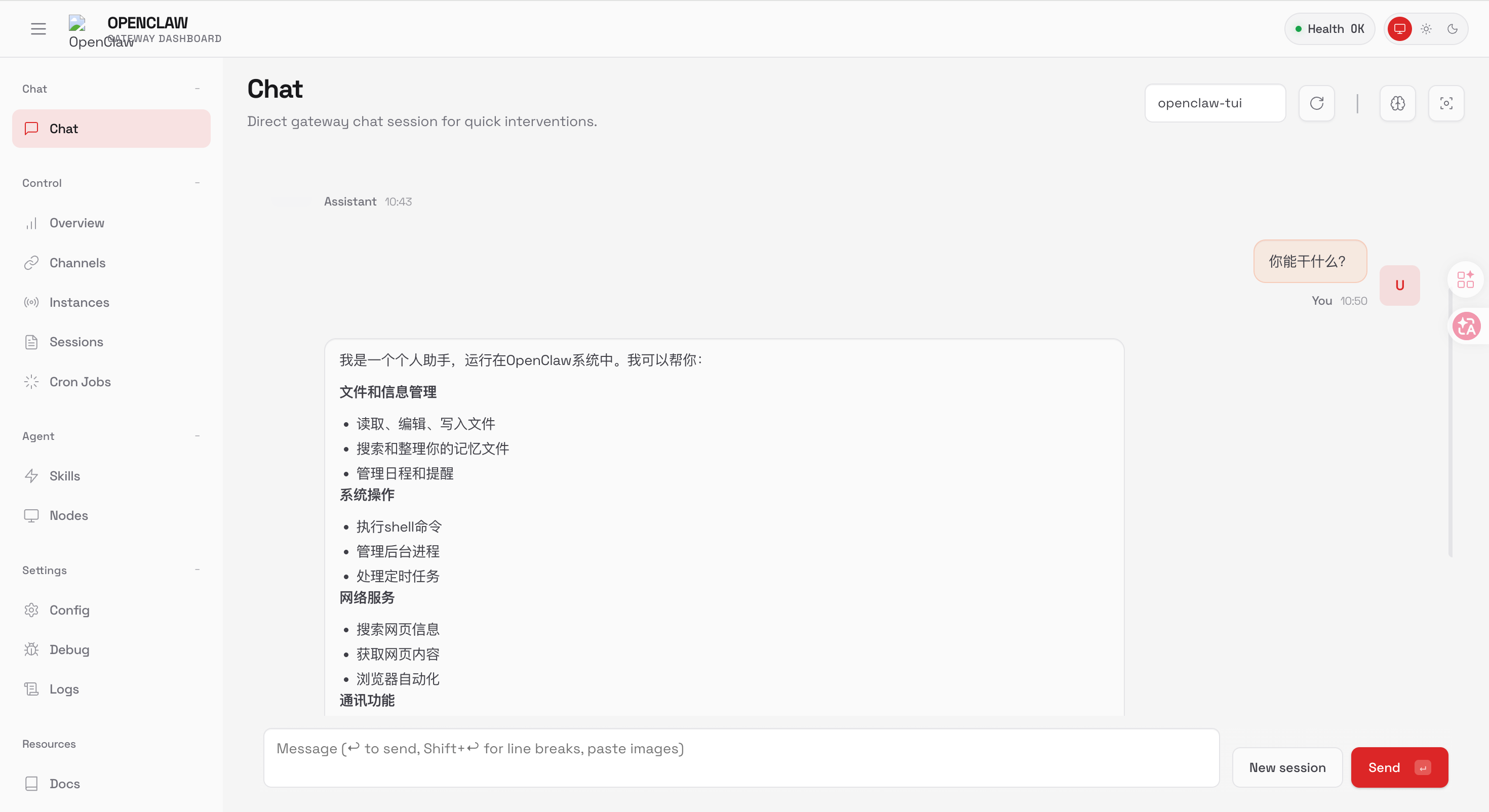 如果你已经跟着本文 成功在本地跑起了 OpenClaw,并打开了 Web UI ,