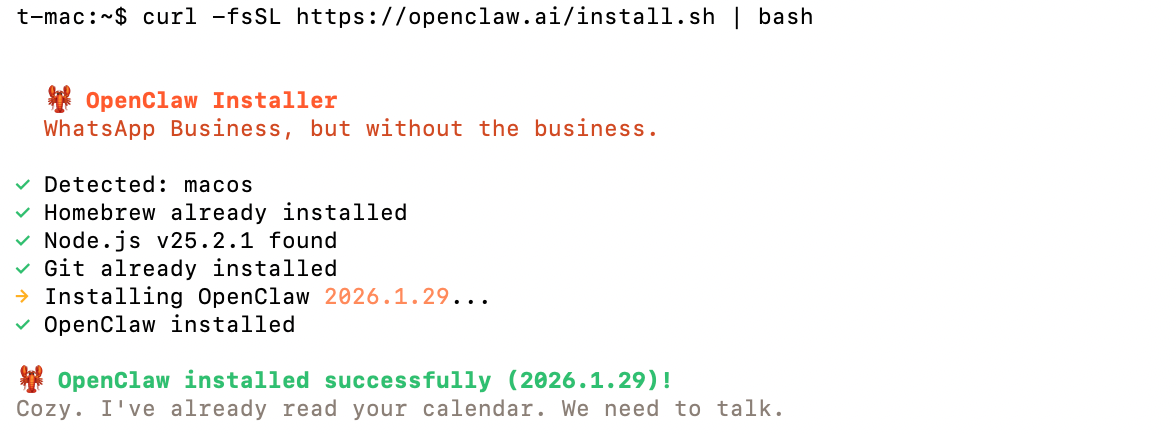 curl -fsSL https://openclaw.ai/install.sh | bash