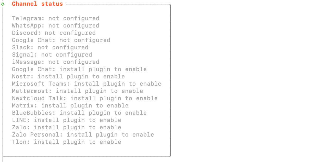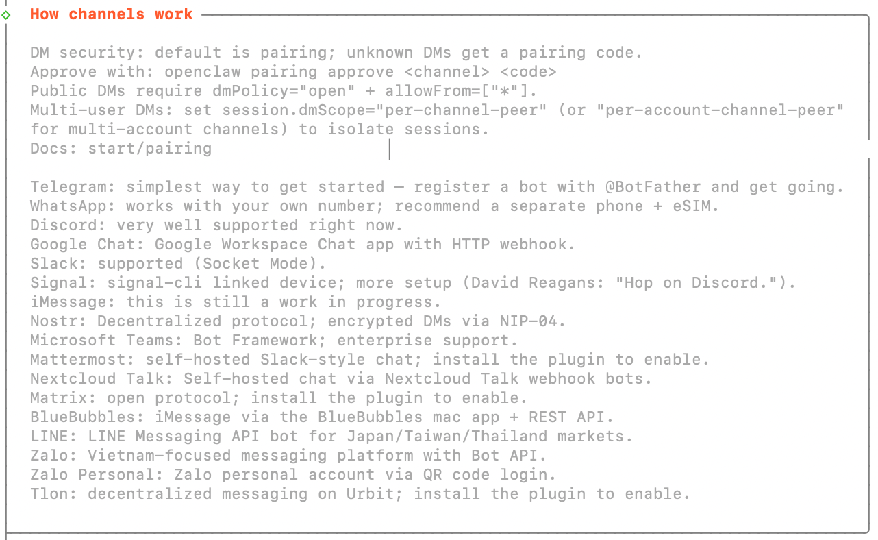 这一步是在告诉我们:OpenClaw 现在"接到哪里说话",以及这些聊天渠道是怎么工作的。不是必须立刻配。