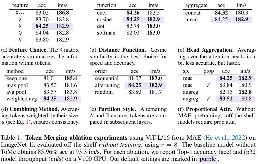 在表 1 中,我们对本方法中所做的设计选择进行了消融研究(ablate) 。对于每项消融实验,我们都从以紫色标记的默认参数开始 。除非另有说明,我们在未经训练的现成 ViT-L/16 MAE 模型(准确率:85.96%,吞吐量:93.3 im/s)上进行测试 ,并以 r = 8 进行合并,这会在网络的 24 层中逐渐移除 98% 的令牌 。