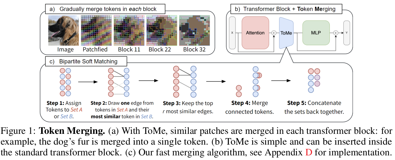 在这项工作中,我们提出了令牌合并(Token Merging,简称 ToMe)来组合令牌,而不是剪枝它们 。由于我们的自定义匹配算法,我们的方法在与剪枝一样快的同时更加准确 。此外,我们的方法在有或没有训练的情况下都能工作,这解锁了它在准确率下降极小的巨大模型上的应用 。在训练期间使用 ToMe,我们观察到训练速度的实际提升,在某些情况下将总训练时间减少了一半 。并且我们在不对图像、视频和音频进行任何修改的情况下应用 ToMe,并发现它在所有情况下都具有与最先进技术(SotA)竞争的实力 。