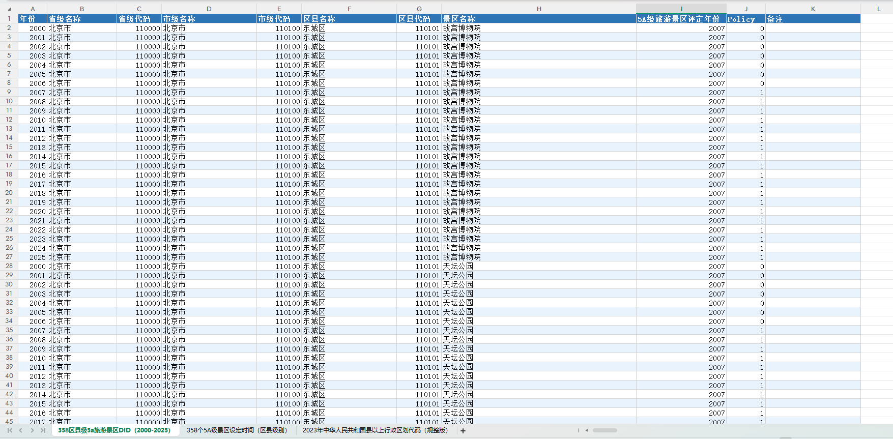 本数据参照Zeyi He,Zhi-An Hu,Wei Huang,Yankun Kang(2025)的研究设计,基于中国5A级旅游景区评定数据与中国县以上行政区划代码构建"区县5A旅游景区政策冲击评估数据集",即通过多阶段数据清洗与匹配方法提取标准化政策变量与结果变量,最终输出结构化的"景区-年份"长面板数据。该数据集包含了景区基础信息、标准化行政区划代码、时间标识以及核心的政策处理变量(Policy),为后续运用多期DID、事件研究法等计量模型,严谨评估5A景区评定对县域旅游经济、人力资本等多元结果的因果效应提供了规范、可靠的数据基础。
