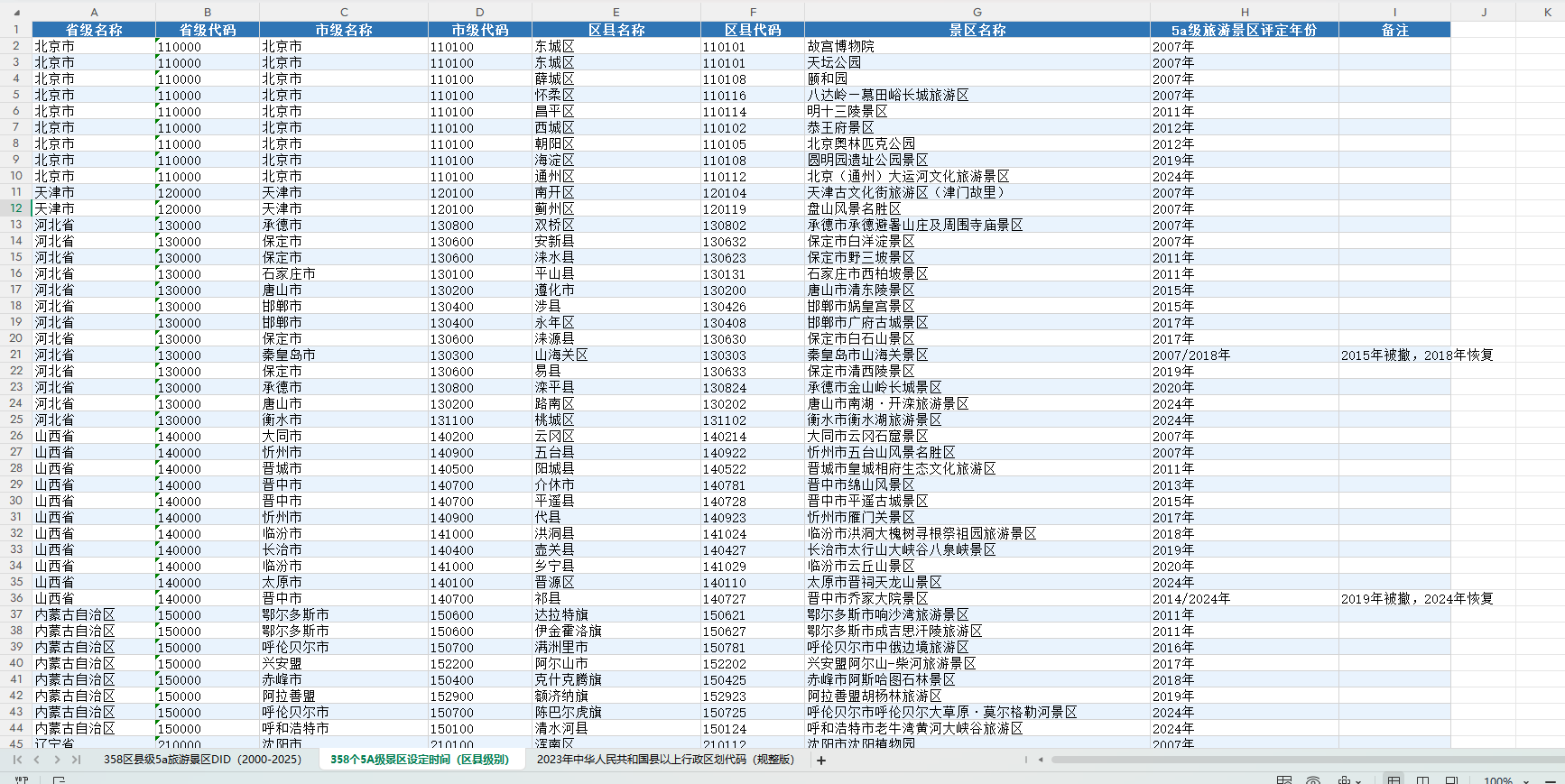 二、数据来源:358个5A级景区设定时间、官方县以上行政区划代码