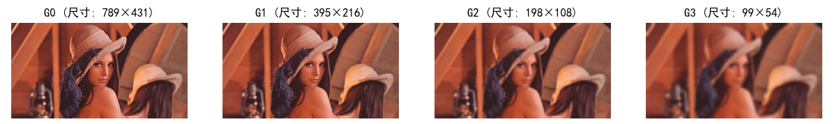 - 底层 G 0 G_0 G0:原始图像,尺寸最大、细节最丰富(能看到小纹理);