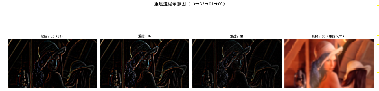 基于高斯金字塔和拉普拉斯金字塔的"拆图+存细节"逻辑,重建原始图像的过程本质是"放大+补细节",步骤清晰且可逆: