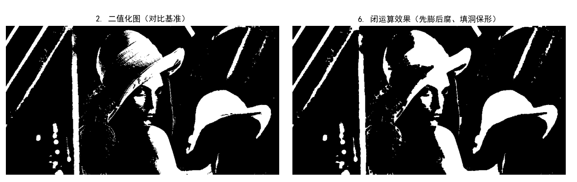 - 直观效果(对比图中左侧二值化图与右侧闭运算效果):