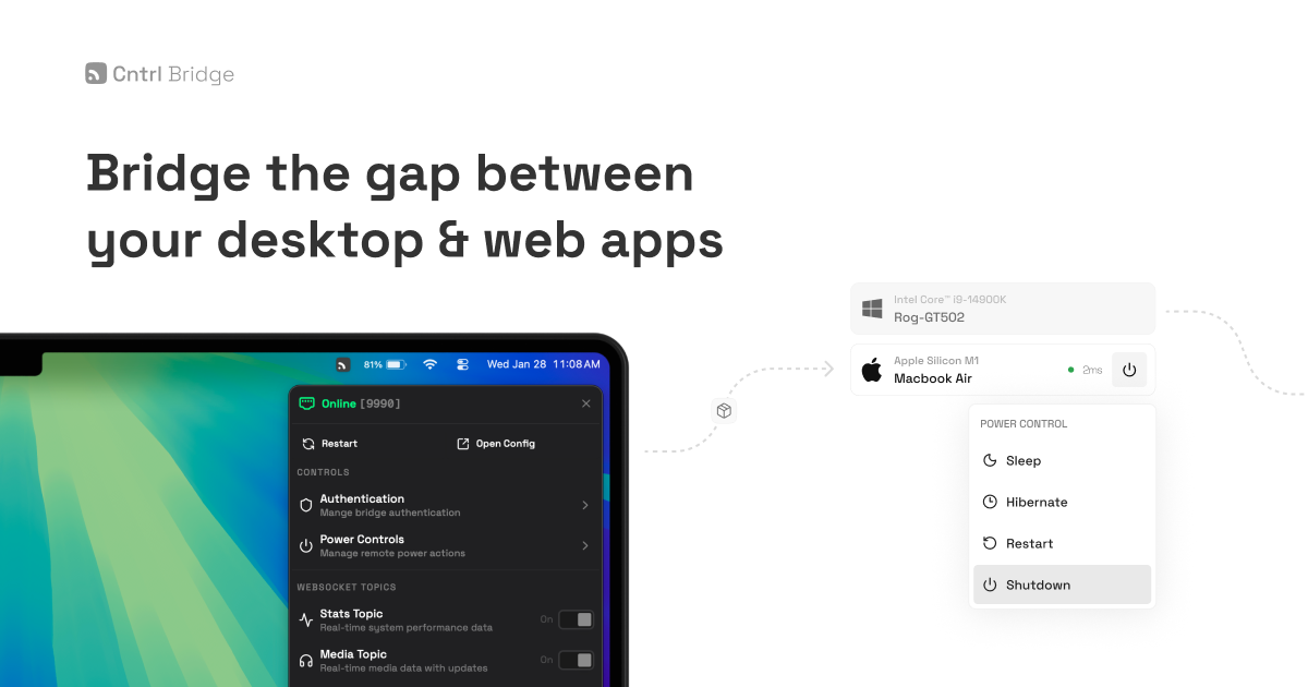 关键词:Cntrl Bridge, 脚本化服务器, Windows, macOS, 本地API, 系统状态监控, 媒体播放控制, 电源管理, Tauri, Rust