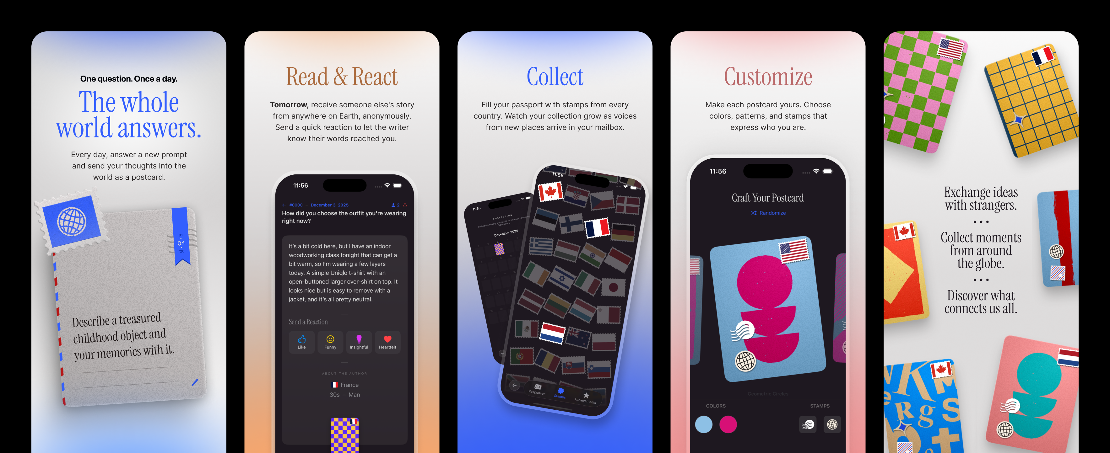介绍:每天一个问题,全球都在作答。每天都会有一个新的提示,让你把自己的想法像明信片一样寄向世界。明天,你将收到来自地球上某个地方的匿名故事。给作者发个简短的反馈,让他们知道他们的文字打动了你。收集来自每个国家的邮票,逐渐让你的护照印满各种印记。当来自新地方的声音抵达你的邮箱,欣赏这份不断增长的收藏。让每张明信片都独一无二,选择能够表达你个性的颜色、图案和邮票。