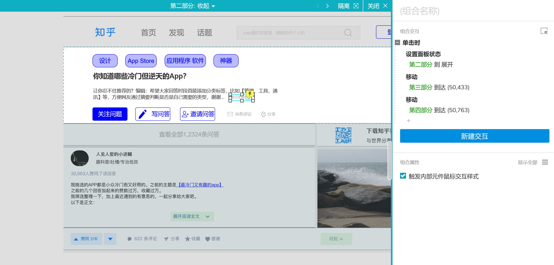四、下面正文部分的上下文交互也是同理,正文可以拓展模块的长度,做法与【第二部分】同理,但是在第二部分展开与收起时需要判断【第三部分】是否展示开收起,适当调整对应位移位置,如果想做滚动就用动态面板嵌套的方式来实现,这里就不过多赘述。