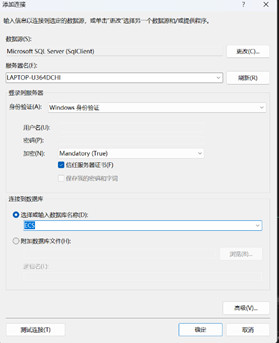 - 导入数据库数据。点击视图,服务器资源管理器,右击数据连接,打开添加连接,服务器名输入LAPTOP-U364DCHI,在下方选择数据库名称。