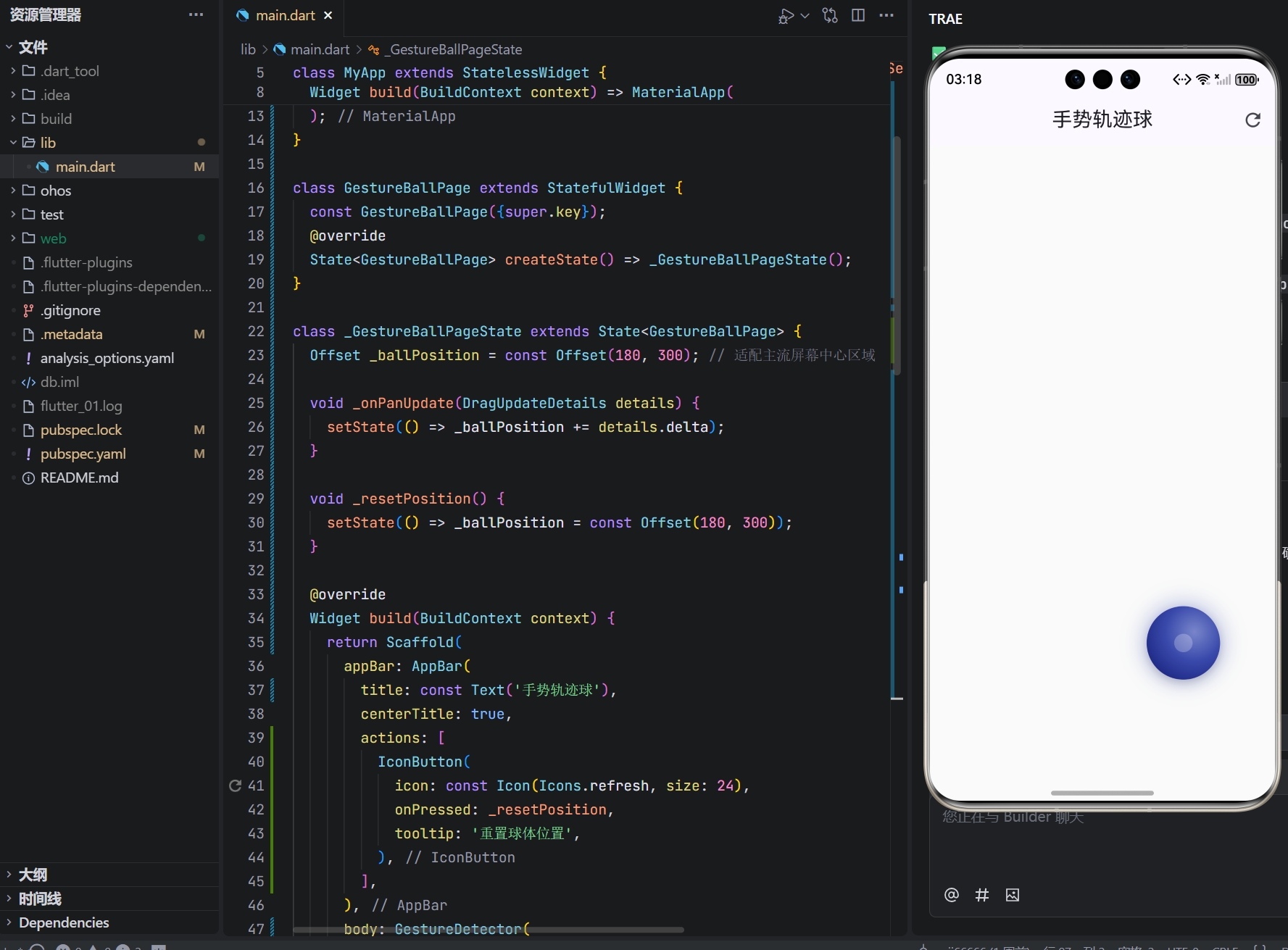 - 重置功能:点击 AppBar 按钮,球体瞬时归位无动画残留。