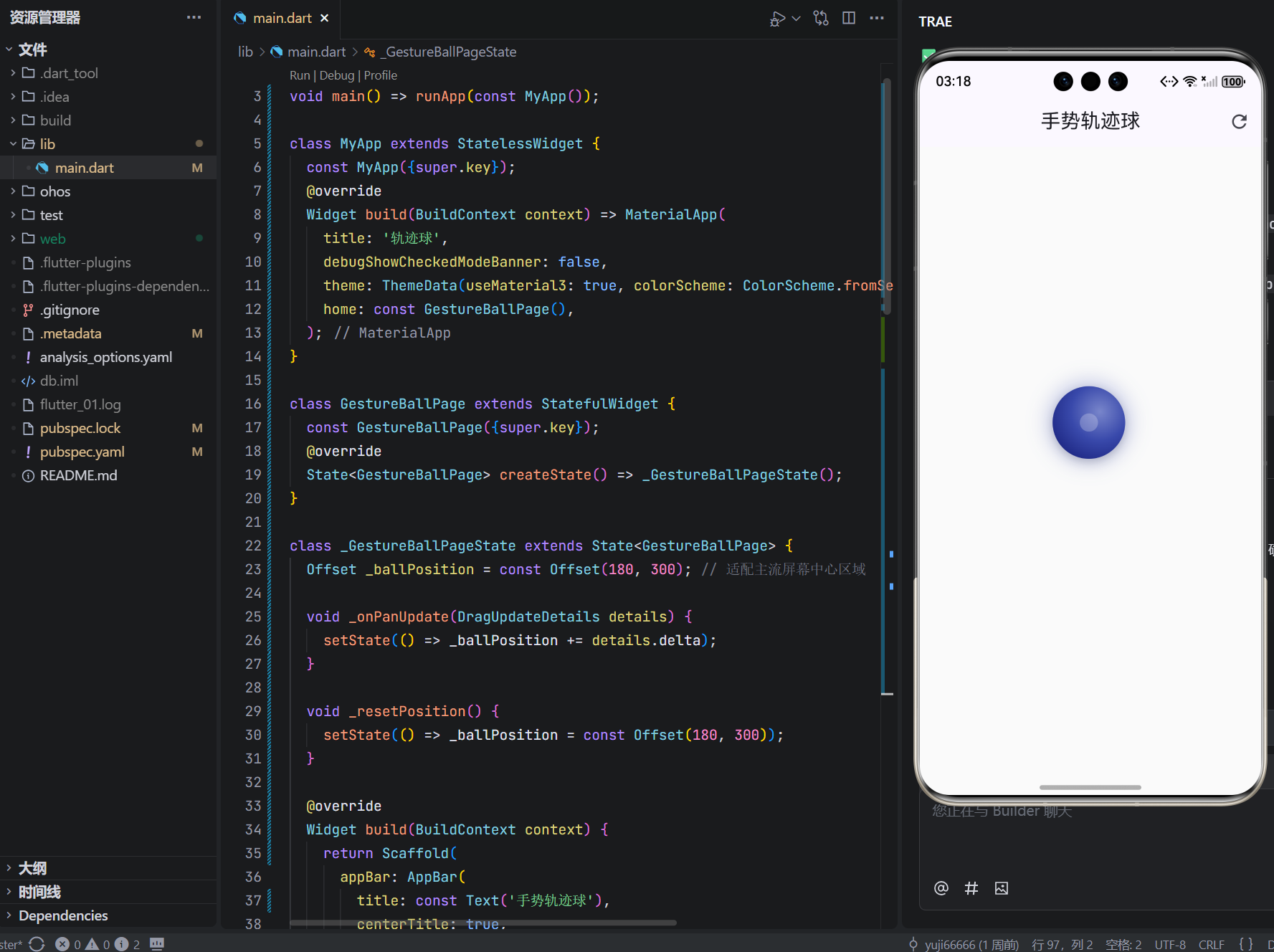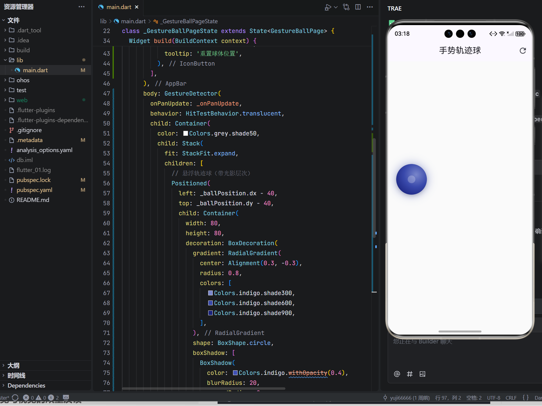 details.delta:本次触摸移动的偏移量(dx, dy);+=:累加偏移,实现连续拖拽;setState:触发 UI 重绘,球体实时跟随;- 无节流/无防抖:因计算仅坐标加法,60fps 流畅无压力。