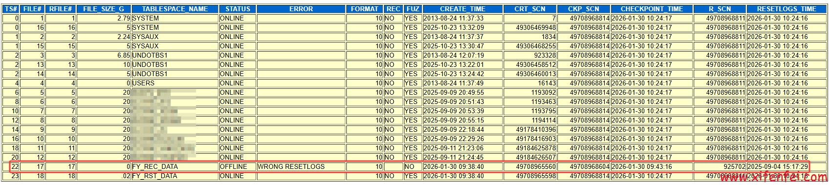 通过Oracle数据库异常恢复检查脚本(Oracle Database Recovery Check)脚本检查发现有文件被offline,且resetlogs 信息不对