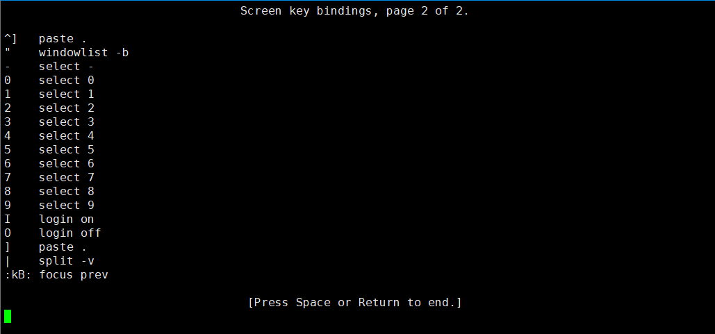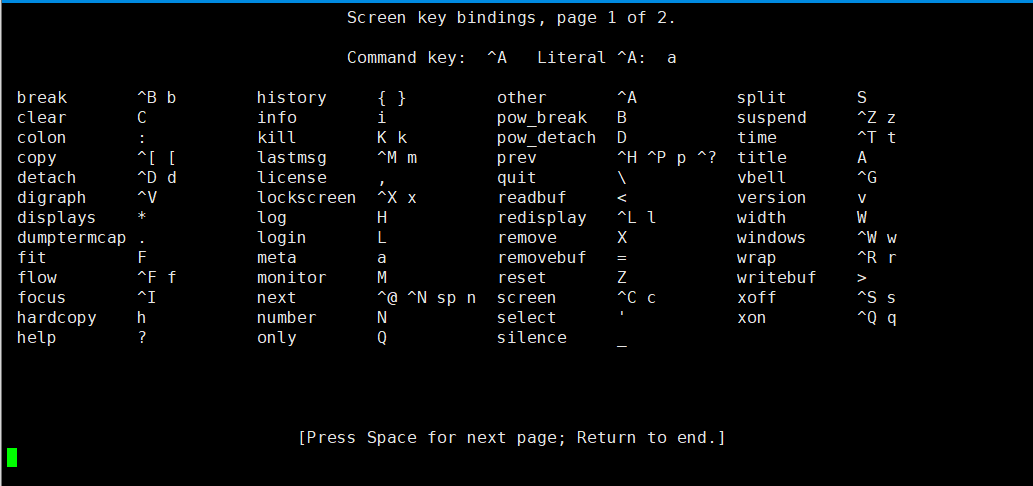按下 Ctrl+A,再输入 ?,即可查看所有可用命令。按 空格键 或 回车键 可退出帮助界面。
