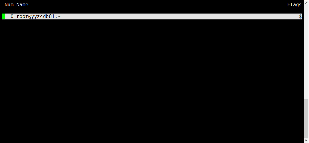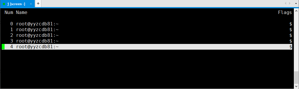 输出信息中,第一列为窗口编号(从 0 开始),第二列为窗口名称,默认格式为 <用户>@<主机名>:<工作目录>。