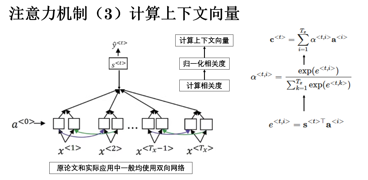- \(\mathbf{c}^{<t>}\) 表示解码器在第 \(t\) 个时间步的上下文向量;
