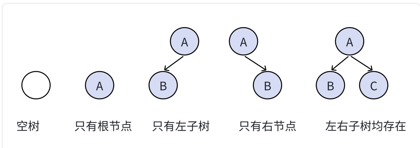 - 二叉树不存在度大于 2 的结点(度只可能为0、1、2)