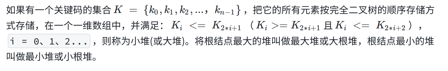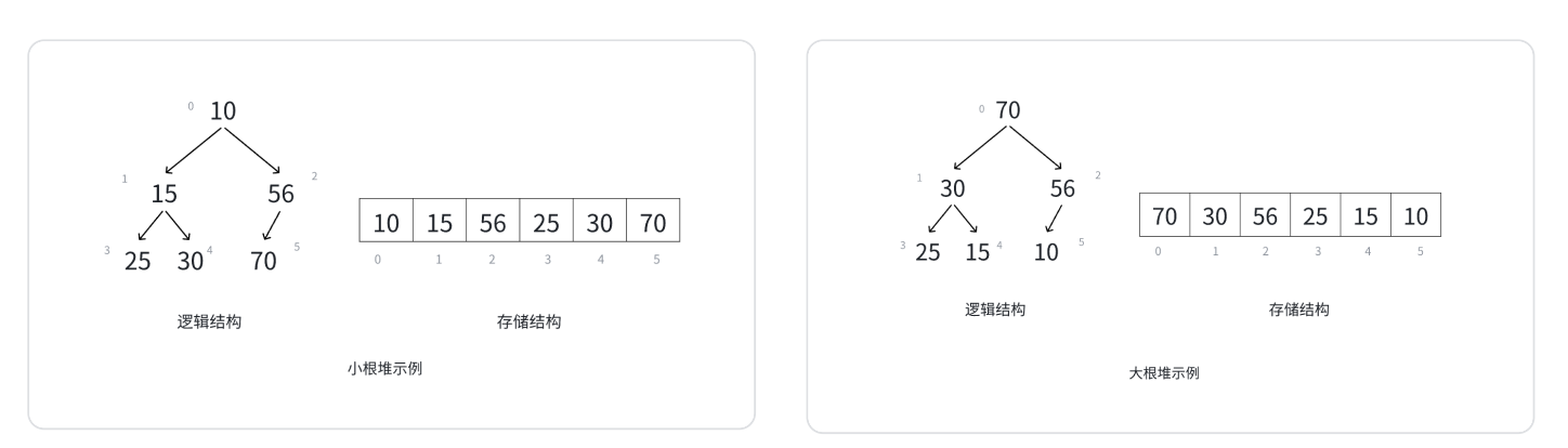 简单来说,堆分为两种,一种是小堆/小根堆,堆顶(根结点)是堆里最小的数据,每个父结点都小于等于其子结点;一种是大堆/大根堆,堆顶(根结点)是堆里最大的数据,每个父结点都大于等于其子结点。