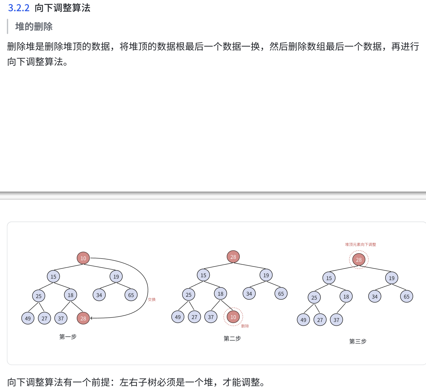 /*关键原因:向下调整的前提是左右子树已经是堆