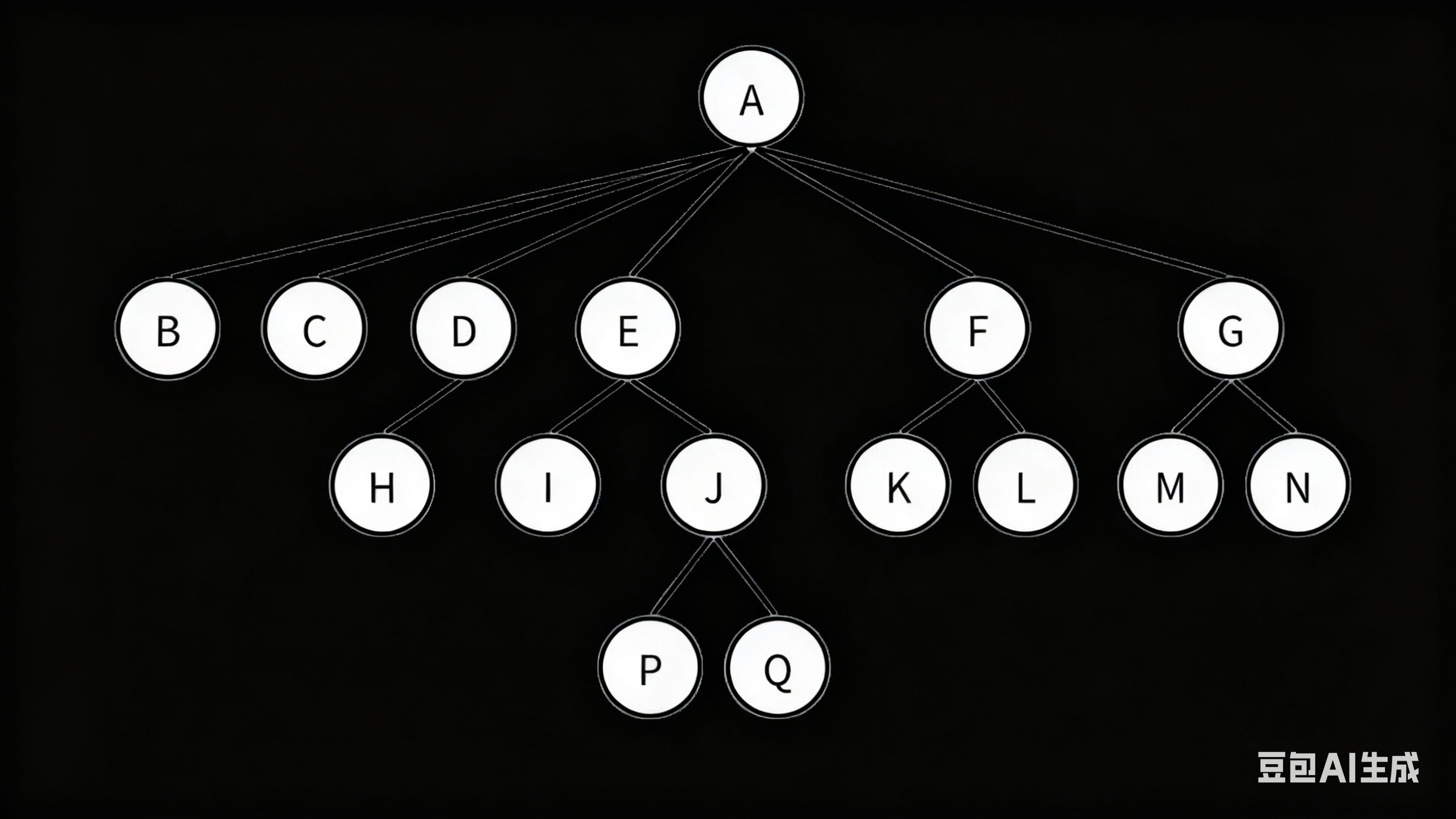 路径:⼀条从树中任意节点出发,沿父节点-子节点连接,达到任意节点的序列;比如A到Q的路径为:A-E-J-Q;H到Q的路径H-D-A-E-J-Q (每两个结点之间的路径是唯一的) - 子孙:以某结点为根的子树中任⼀结点都称为该结点的子孙。如上图:所有结点都是A的子孙