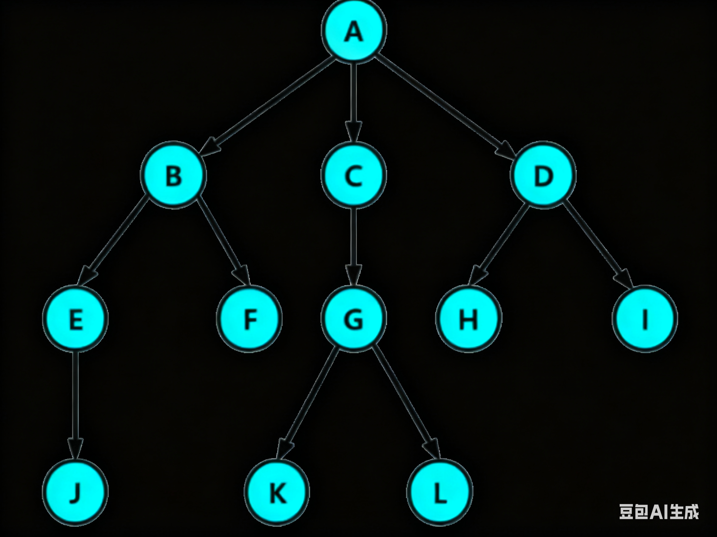 - 分支结点/非终端结点:度不为 0 的结点; 如上图: D、E、F、G... 等结点为分支结点
