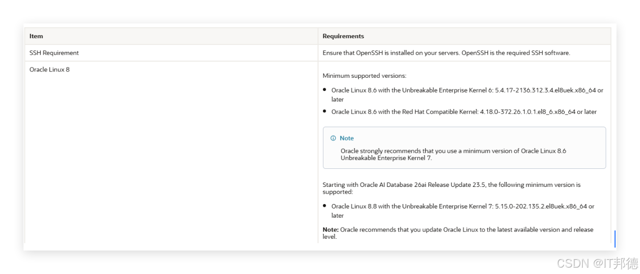 root@aiserver \~\]# getenforce Disabled ### 2.2 yum配置 [root@aiserver ~]# mount | grep sr0 mount /dev/cdrom /mnt echo "[localREPO]" >> /etc/yum.repos.d/my.repo echo "name=localhost8" >> /etc/yum.repos.d/my.repo echo "baseurl=file:///mnt/BaseOS" >> /etc/yum.repos.d/my.repo echo "gpgcheck=0" >> /etc/yum.repos.d/my.repo echo "enabled=1" >> /etc/yum.repos.d/my.repo echo "[localREPO_APP]" >> /etc/yum.repos.d/my.repo echo "name=localhost8_app" >> /etc/yum.repos.d/my.repo echo "baseurl=file:///mnt/AppStream" >> /etc/yum.repos.d/my.repo echo "gpgcheck=0" >> /etc/yum.repos.d/my.repo echo "enabled=1" >> /etc/yum.repos.d/my.repo [root@aiserver yum.repos.d]# yum repolist  ### 2.3、安装依赖包 以下命令安装依赖包 yum install bc \ binutils \ compat-openssl10 \ elfutils-libelf \ fontconfig \ glibc \ glibc-devel \ ksh \ libaio \ libXrender \ libX11 \ libXau \ libXi \ libXtst \ libgcc \ libstdc++ \ libxcb \ libibverbs \ libasan \ liblsan \ librdmacm \ make \ policycoreutils \ policycoreutils-python-utils \ smartmontools \ sysstat -y ### 2.4、安装preinstall cd /opt rpm -ivh oracle-ai-database-preinstall-26ai-1.0-1.el8.x86_64.rpm  ### 2.5、创建目录 mkdir -p /u01/app/oracle/product/23.26.1/db_1 chown -R oracle:oinstall /u01 chmod -R 775 /u01 ### 2.6、修改/etc/hosts cat \>\> /etc/hosts \<\< EOF 192.168.6.10 aiserver EOF ### 2.7、设置 oracle 口令 passwd oracle chage -l 用户名 查看某个用户的密码过期时间等信息 chage -M 180 jeames 可以用chage -M days username来设置 ### 2.8、设置环境变量 su - oracle vi \~/.bash_profile export ORACLE_SID=orcl export ORACLE_BASE=/u01/app/oracle export ORACLE_HOME=$ORACLE_BASE/product/23.26.1/db_1 export PATH=$PATH:$ORACLE_HOME/bin export LD_LIBRARY_PATH=$LD_LIBRARY_PATH:$ORACLE_HOME/lib export CLASSPATH=$ORACLE_HOME/JRE:ORACLE_HOME/jlib:$ORACLE_HOME/rdbms/jlib export NLS_LANG="AMERICAN_AMERICA.AL32UTF8" source .bash_profile ### 2.8、软件包上传 软件包上传到 ORACLE_HOME 目录(oracle 用户解压) su - oracle unzip /opt/LINUX.X64_2326100_db_home.zip -d $ORACLE_HOME ### 2.9、安装 [root@aiserver ~]# su - oracle [oracle@aiserver ~]$ cd $ORACLE_HOME [oracle@aiserver db_1]$ ./runInstaller MobaXterm调用图形化界面: export DISPLAY=192.168.6.1:0.0 echo $DISPLAY   /u01/app/oraInventory/orainstRoot.sh /u01/app/oracle/product/23.26.1/db_1/root.sh  以下操作为netca的监听  以下为DBCA建库的过程