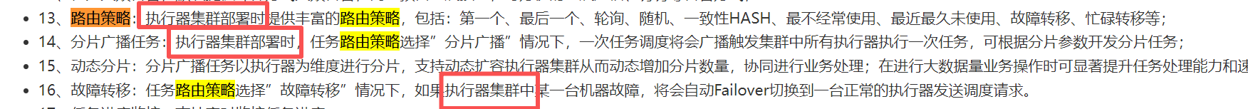 路由策略:当执行器集群部署时,提供丰富的路由策略,包括;FIRST(第一个):固定选择第一个机器;LAST(最后一个):固定选择最后一个机器;ROUND(轮询):;RANDOM(随机):随机选择在线的机器;CONSISTENT_HASH(一致性HASH):每个任务按照Hash算法固定选择某一台机器,且所有任务均匀散列在不同机器上。LEAST_FREQUENTLY_USED(最不经常使用):使用频率最低的机器优先被选举;LEAST_RECENTLY_USED(最近最久未使用):最久未使用的机器优先被选举;FAILOVER(故障转移):按照顺序依次进行心跳检测,第一个心跳检测成功的机器选定为目标执行器并发起调度;BUSYOVER(忙碌转移):按照顺序依次进行空闲检测,第一个空闲检测成功的机器选定为目标执行器并发起调度;SHARDING_BROADCAST(分片广播):广播触发对应集群中所有机器执行一次任务,同时系统自动传递分片参数;可根据分片参数开发分片任务;- 子任务:每个任务都拥有一个唯一的任务ID(任务ID可以从任务列表获取),当本任务执行结束并且执行成功时,将会触发子任务ID所对应的任务的一次主动调度。