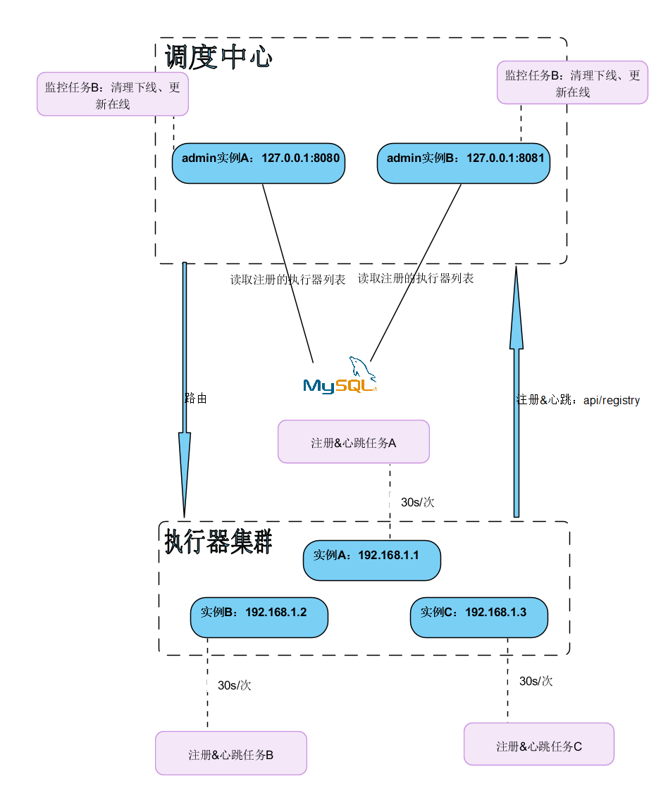 在这个架构下面,执行器是集群、调度中心假设为单机,数据源为Mysql: