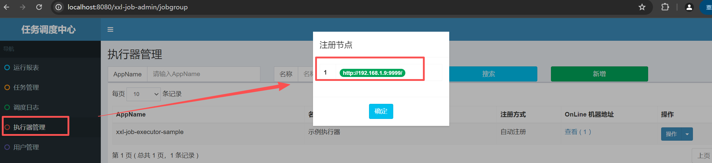 注册完成之后,再来分别查看xxl-job-admin的控制台,会现在注册上去的执行器列表: