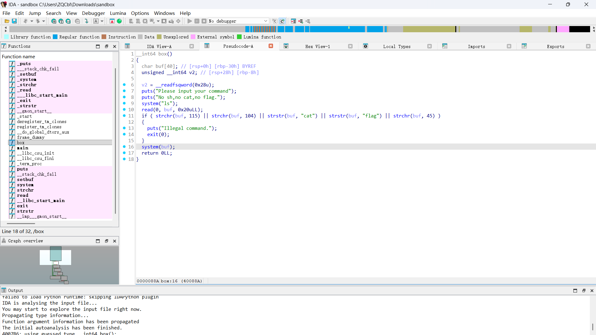 用IDA打开附件,发现box函数,发现不能输入cat flag