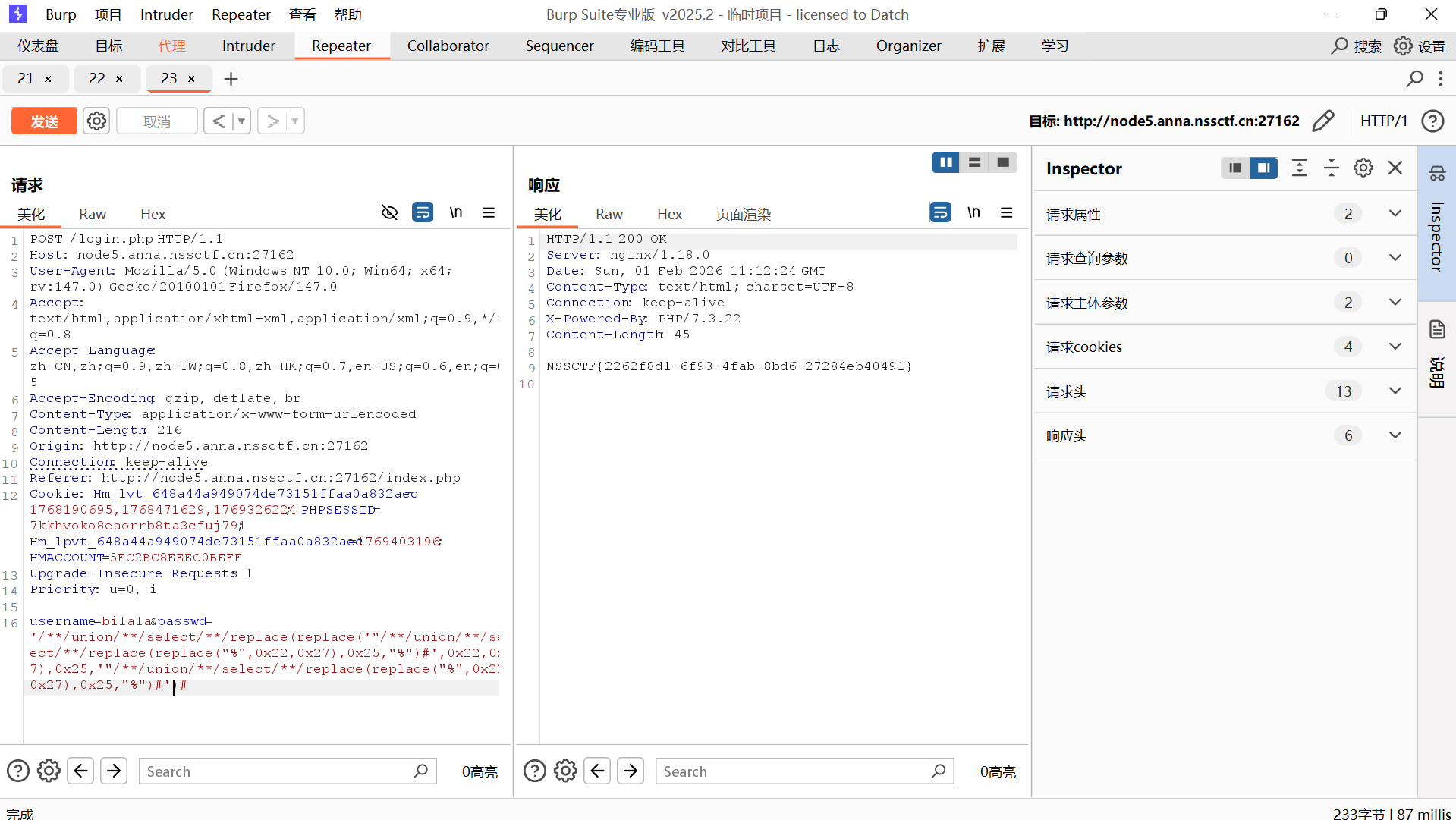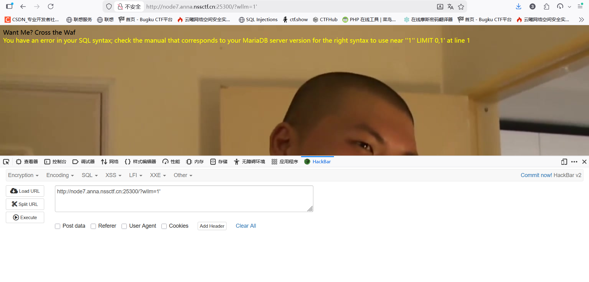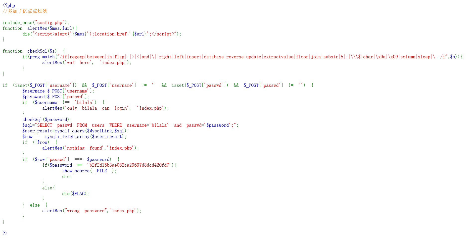 根据题目提示,得知用户名为bilala,注入点为password,尝试输入1' or 1=1#,发现被waf拦截