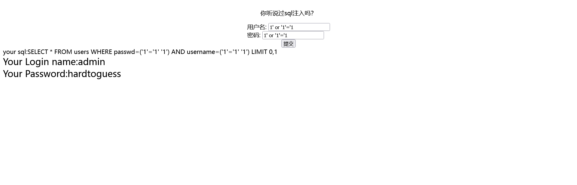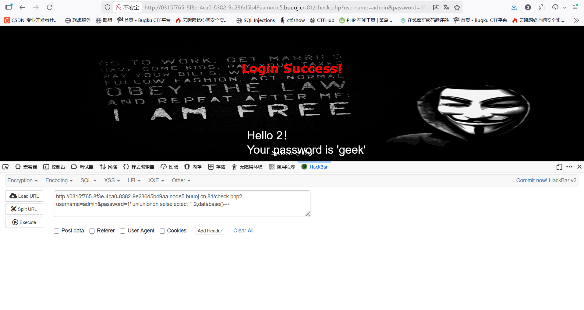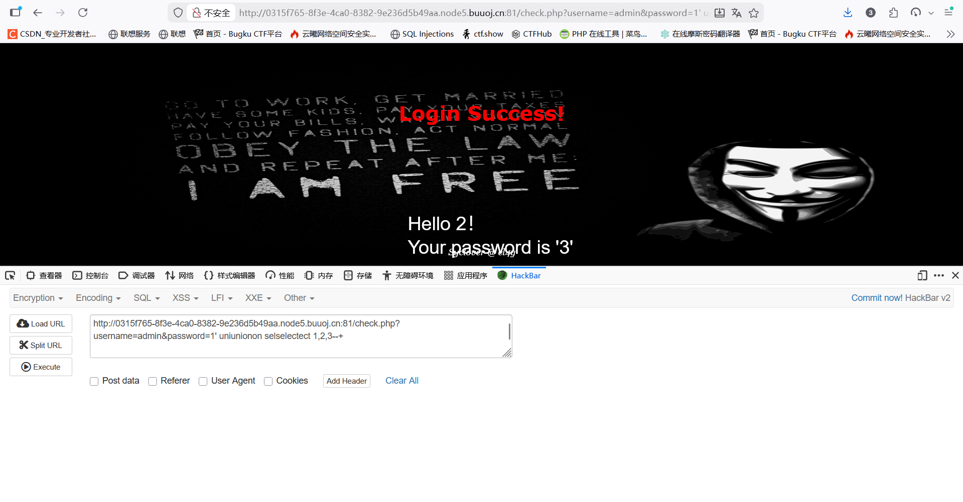 其中根据源码,三段中有一段为admin,经过测试后发现2为admin,1' union select 1,'admin,3#