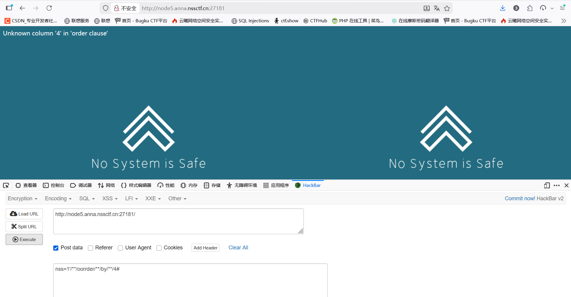 先判断列数,nss=-1'/**/oorrder/**/by/**/4#,出现报错,列数为3
